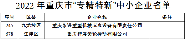 6月1日,重慶市經(jīng)濟(jì)和信息化委員會公布了2022年重慶市“專精特新“中小企業(yè)名單,經(jīng)主管部門審核推薦、第三方機(jī)構(gòu)評審和公示等程序,重慶智展齒輪傳動有限公司、重慶永進(jìn)重型機(jī)械成套設(shè)備有限責(zé)任公司均成功入選。